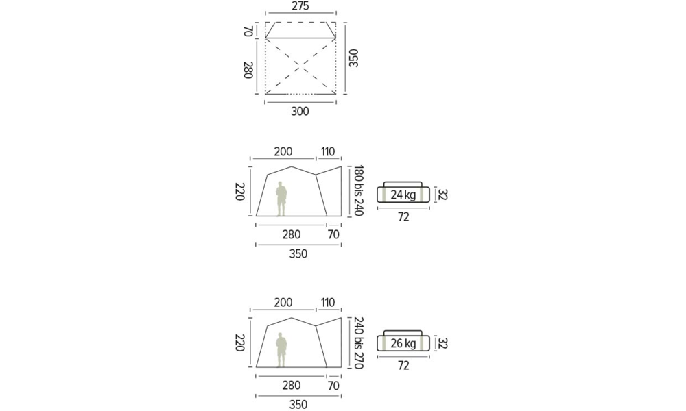 Länge 300 cm Breite / Tiefe 280 cm Höhe 240 cm Gewicht 24 kg -