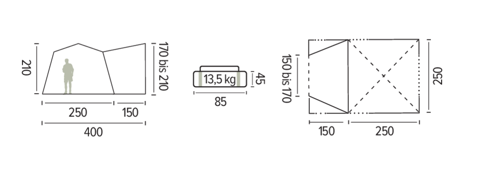 Länge 400 cm Breite / Tiefe 250 cm Höhe 210 cm Gewicht 13,5 kg