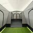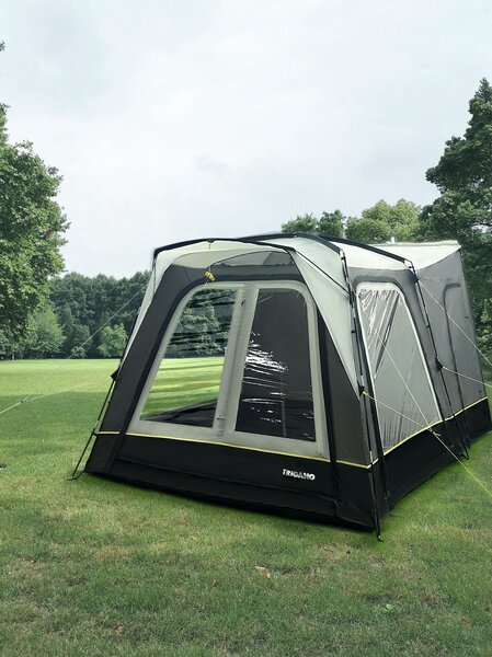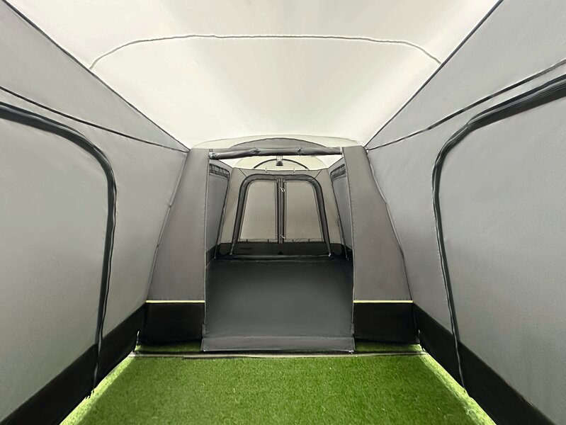 Dank dieses Heckzelts werden Ihre Reisen bald wesentlich komfortabler und praktischer. Dieses innovative Design wurde speziell für die Montage am Heck eines Fahrzeugs entwickelt. Die Heckklappe des Fahrzeugs kann weiterhin geöffnet und geschlossen werden. Mit einer Tiefe von 4 m ist das freistehende Heckzelt sowohl geräumig als auch komfortabel. Große Klarsichtfenster mit Innenklappen sorgen dafür, dass Sie es tagsüber schön hell und freundlich haben. Die Trenntür zwischen der Schleuse und dem Wohnraum erlaubt, je nach Belieben zwei verschiedene Bereiche zu schaffen.