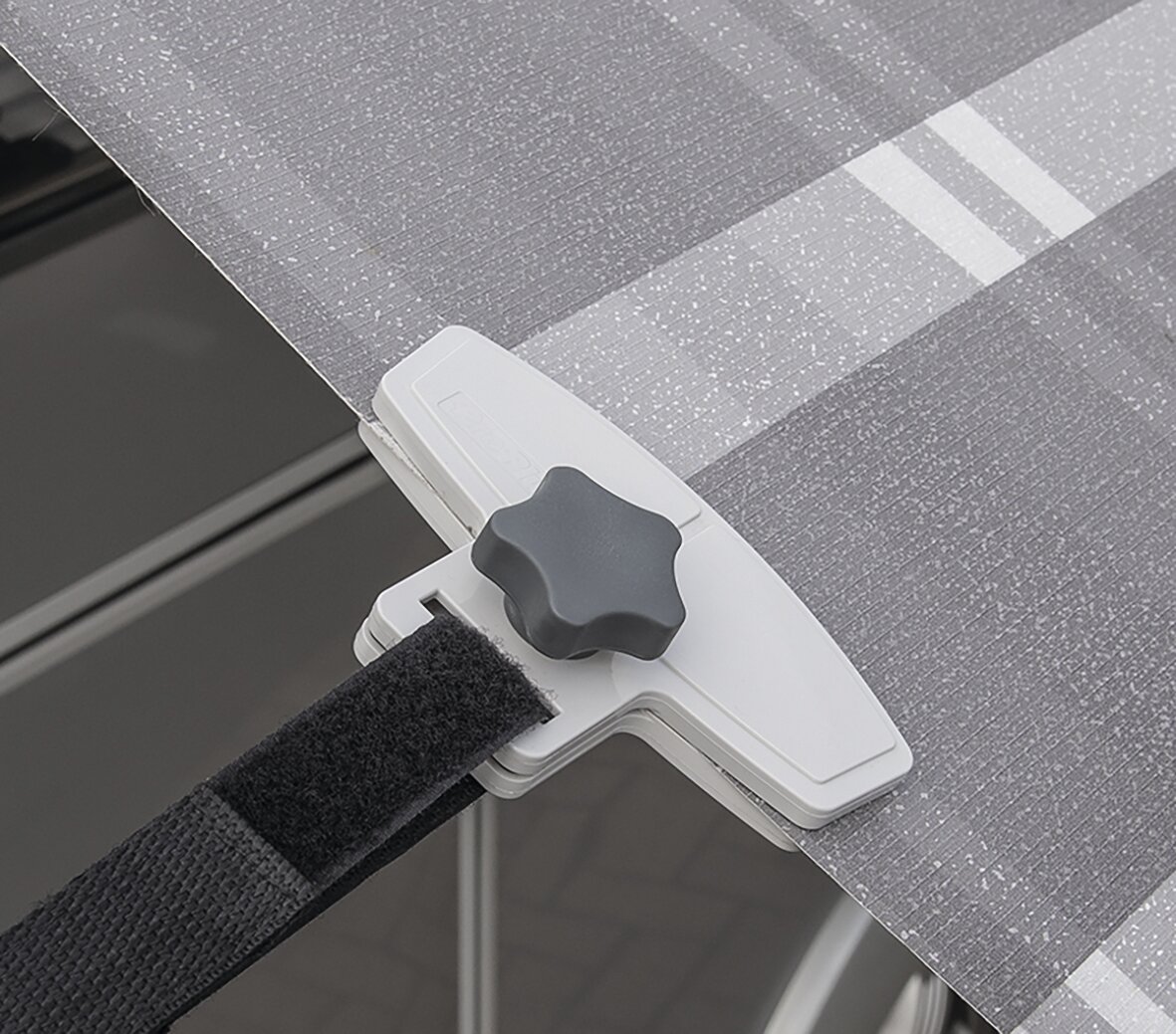 Verhindert Gewebeschäden durch Flatterbewegungen bei starkem Wind. Gehäuse aus Kunststoff.