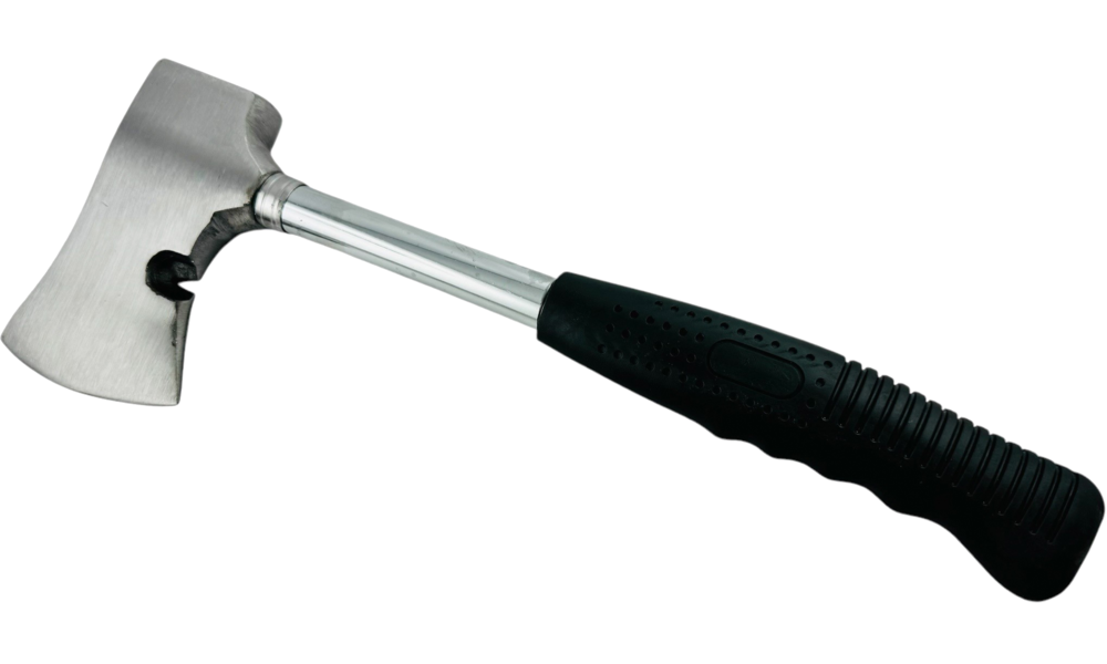 Sehr stabiles Stahlbeil mit rutschfestem Gummigriff, inklusive Schutztasche.