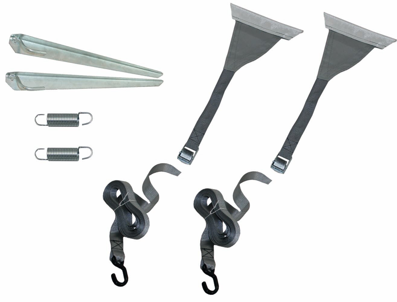 Das Sturmband-Set besteht aus 2 großen, soliden Bodenankern, 2 Spannfedern, 2 Gurten mit Kunststoffhaken von 4,8 m und 2 dreieckigen Gurten, die in die Frontbox der Markise gleiten. Der Gurt ist 17,5 cm breit und hat eine Sehnenstärke von 6,5 mm. Das Abspannset ist ideal für die Markise Ihres Wohnmobils oder Wohnwagens.