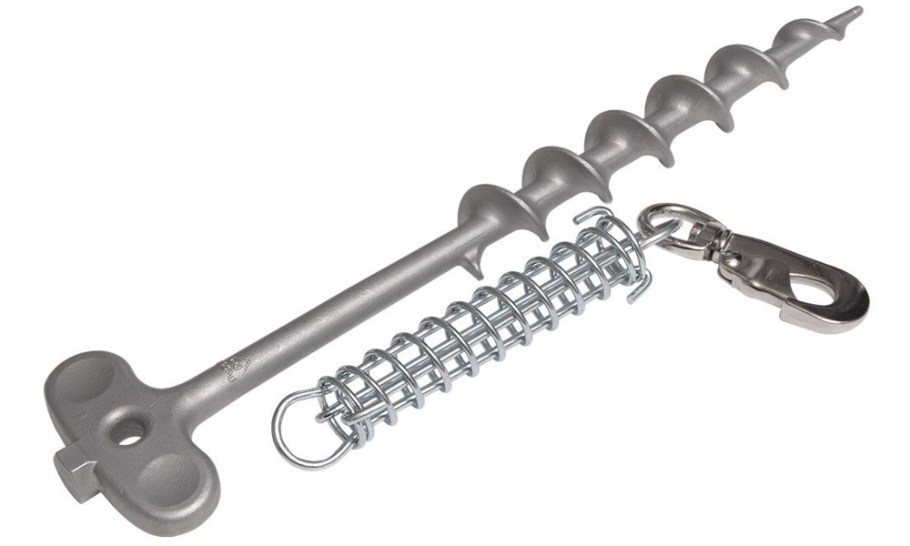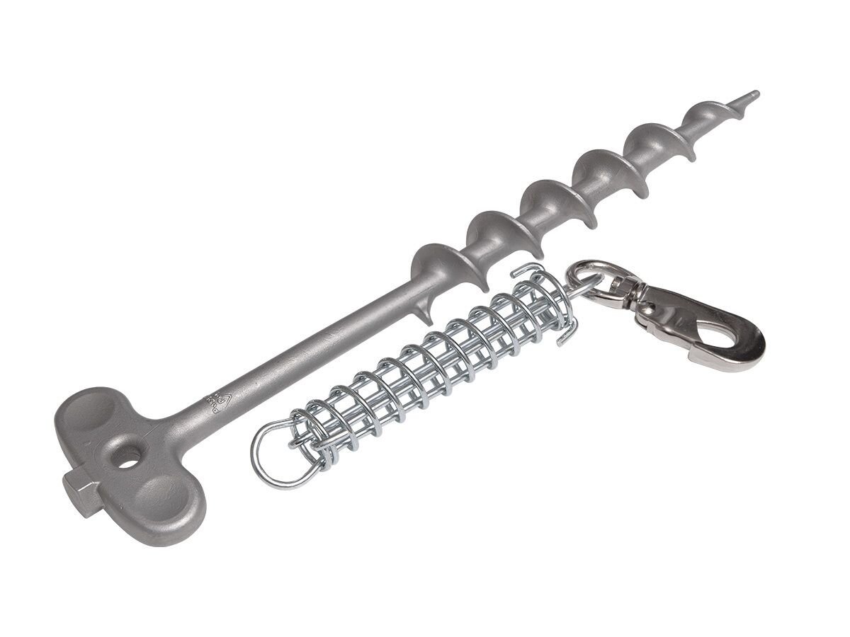 Stabiler Erdbodenanker aus recyceltem Edelstahl mit integriertem Stoßdämpfer zum sicheren Anleinen von Hunden, Katzen, etc. Für viele Boden-