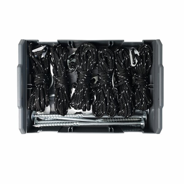 • Lieferumfang: 1x Set mit 6x Zeltschraube 8x220 mm, 6x Zeltschnur (4m, Ø 4 mm) schwarz/reflektierend mit Alu-Dreilochspanner + Heringslasche, 6x weiße Kunststoff-Unterlegscheibe Ø 35 mm, 1x Bit TX40 in der L-BOXX Mini, 19 tlg., 094901512