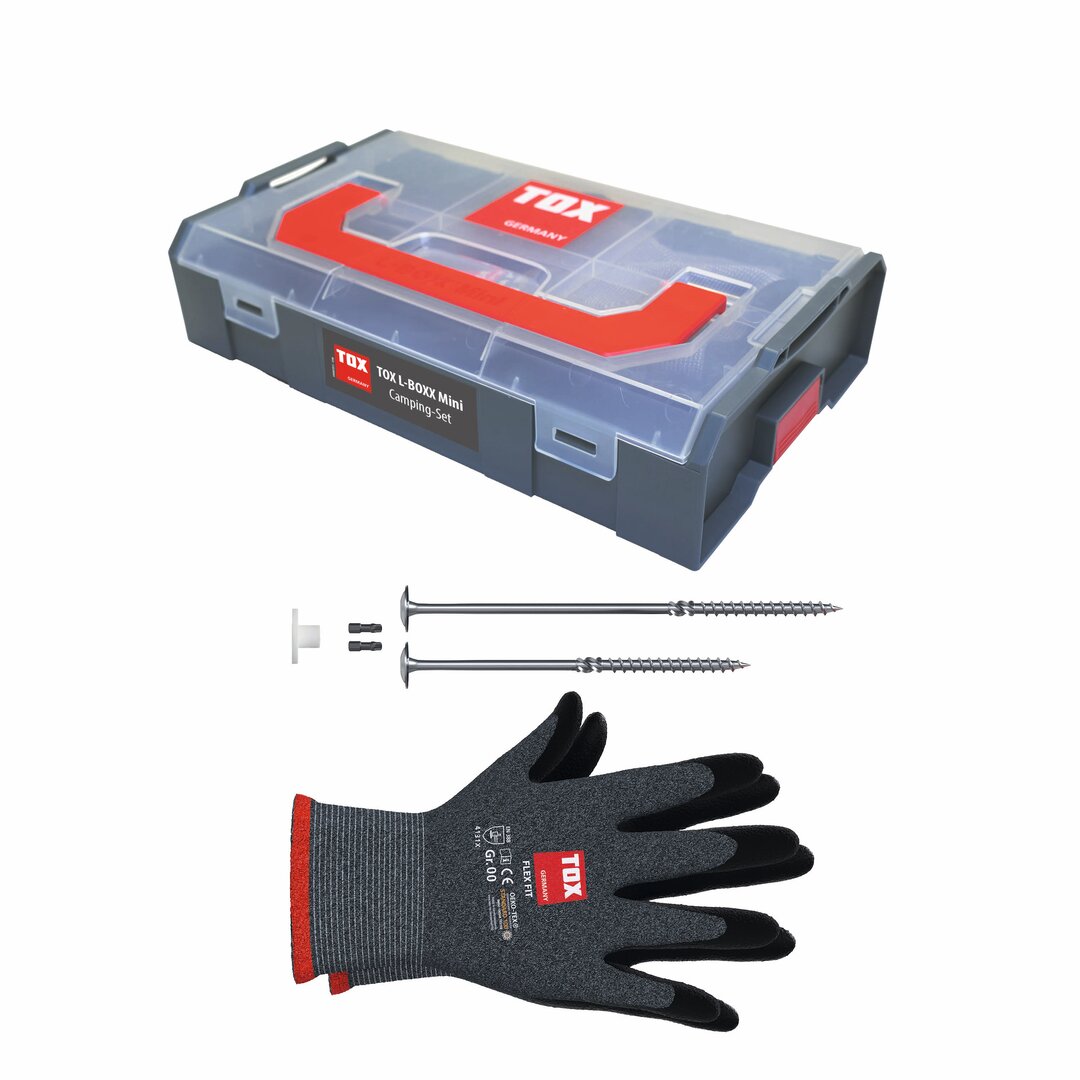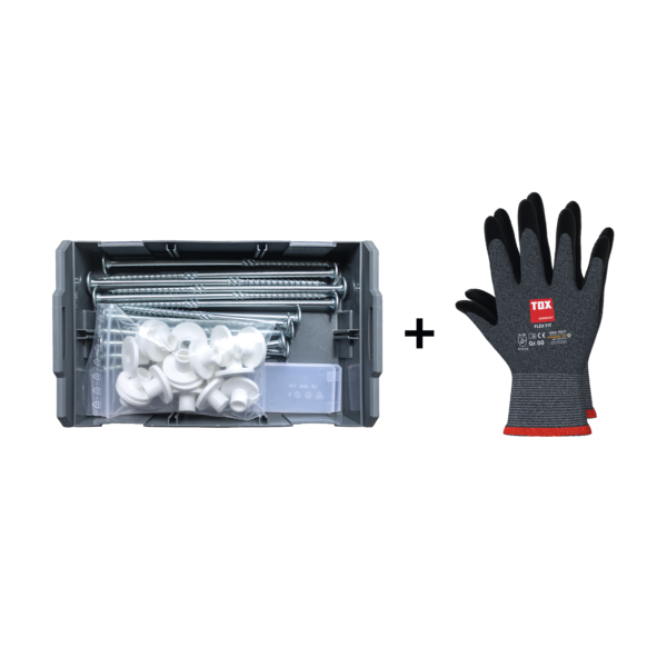 • Lieferumfang: 1x Set mit 18x Tellerkopfschrauben 8x160mm (8 St.) + 8x220mm (10 St.), 18x Weiße Kunststoff-Unterlegscheiben Ø35mm, 2x Bit TX40, 1 Paar Montagehandschuhe Gr. 9, 1x L-BOXX Mini