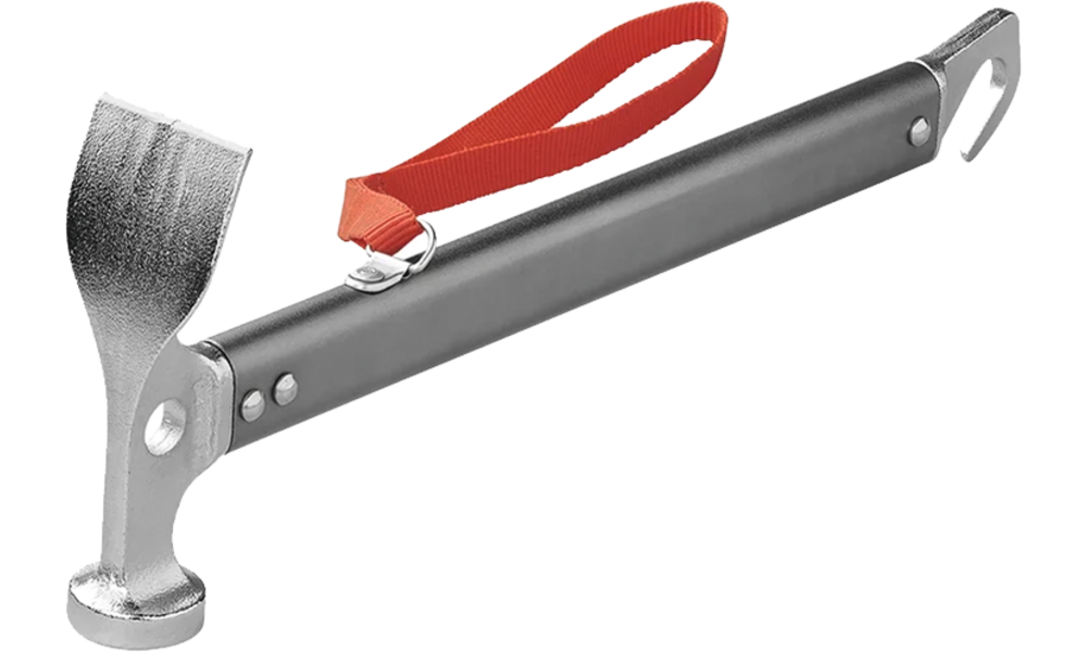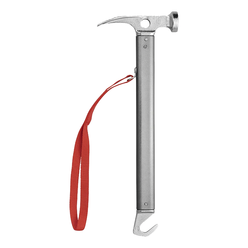 Leichter Aluminiumgriff, robuster Stahlkopf, Heringsauszieher und Sicherheits-Handschlaufe.
